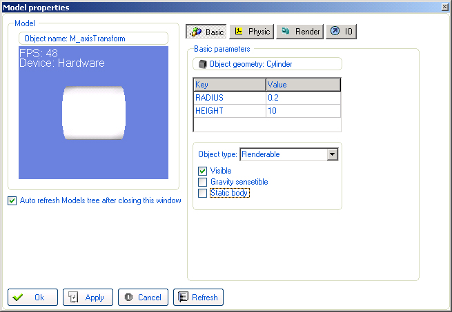 - Создаем груз маятника MASS - Sphere с размерами: Radius - 0.5.