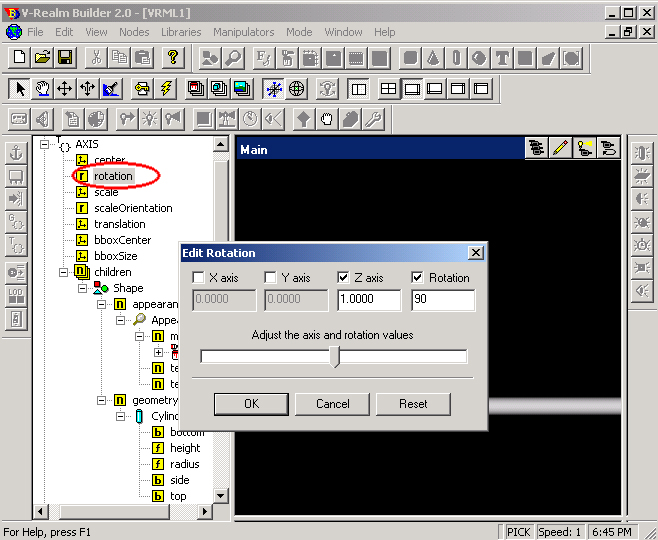 - Создаем направляющую AXIS - Cylinder с размерами: Radius - 0.2 Height - 10