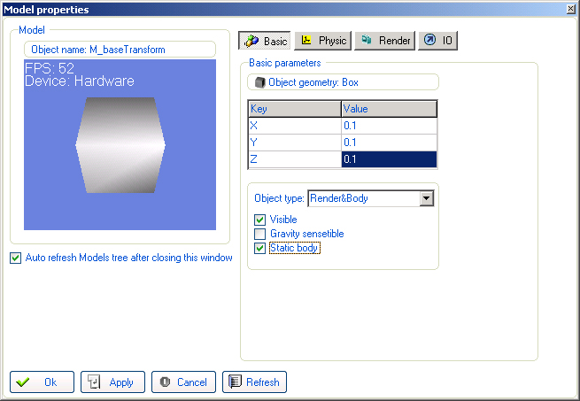 - Создаем основание модели BASE (оно будет неподвижно - Static body) - Box с размерами 0.1х0.1х0.1.